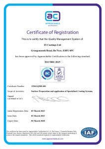 FI Coatings has committed time and resource to achieve and maintain various certification, including ISO 9001 certification since 2010 and ISO 14001 certification since 2016. We also hold a PPC permit as issued by SEPA. Through these certifications, and ongoing monitoring we are demonstrating our commitment to quality of service, the environment and health and safety of our staff and clients.